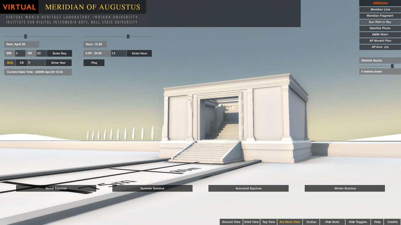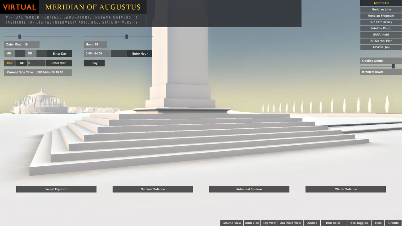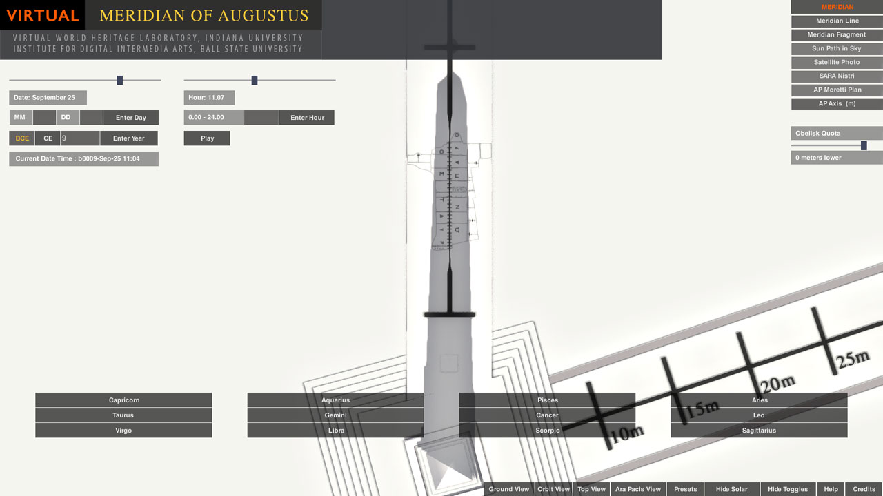 A celestial tracking simulator of the Meridian of Augustus site in ancient Rome designed to track the movement of the Sun and test its effects on the site.